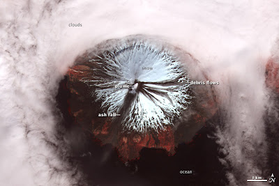 A ilha localizada na parte central da imagem, Chuginadak, contém Mt. Cleveland, um agitado vulcão activo, que está a ser observado, pois as suas cinzas poderiam ameaçar os voos entre a Ásia ea América do Norte.