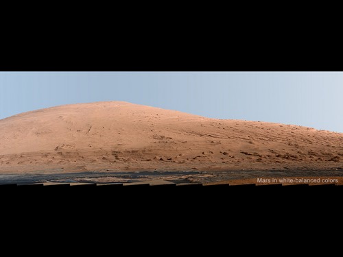 Mosaico de imagens da câmara do mastro (Mastcam) do robô Curiosity, em Marte, mostrando o Monte Sharp, com uma cor melhorada, que torna o céu marciano excessivamente azul, mas mostra o terreno como se estivésse iluminado na Terra. Isto ajuda os cientistas a reconhecerem materiais rochosos, baseando-se na sua experiência de observação de rochas no nosso planeta.